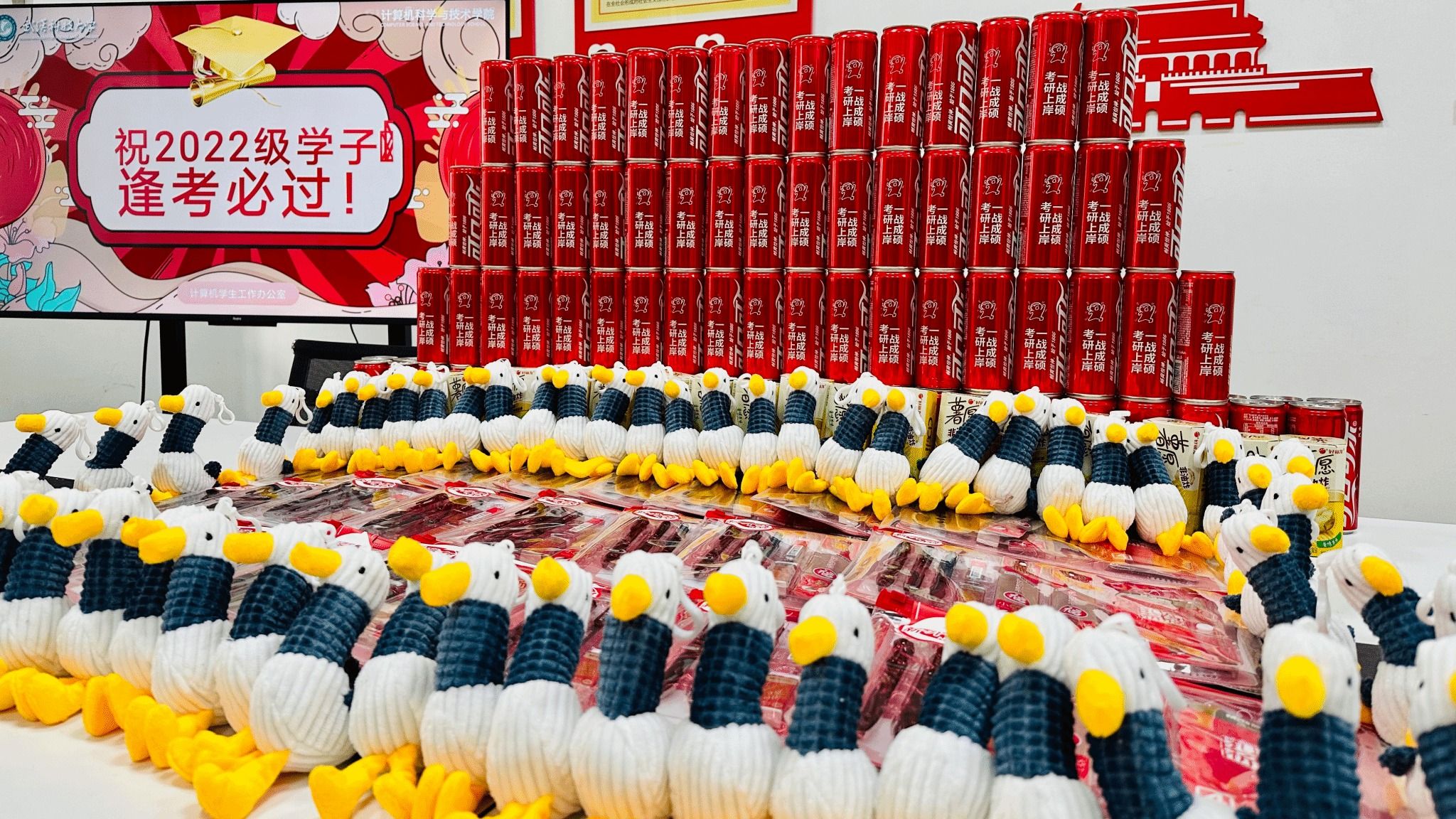 精心筹备的慰问品兼具实用性与心意:文具袋内含考试必备的中性笔、橡皮等用品;薯愿薯片寓意“薯你心愿”;有传递着乐观向上精神的“加油鸭”玩偶;印刻着“考研上岸,一战成硕”的专属定制可乐;更有色情小说