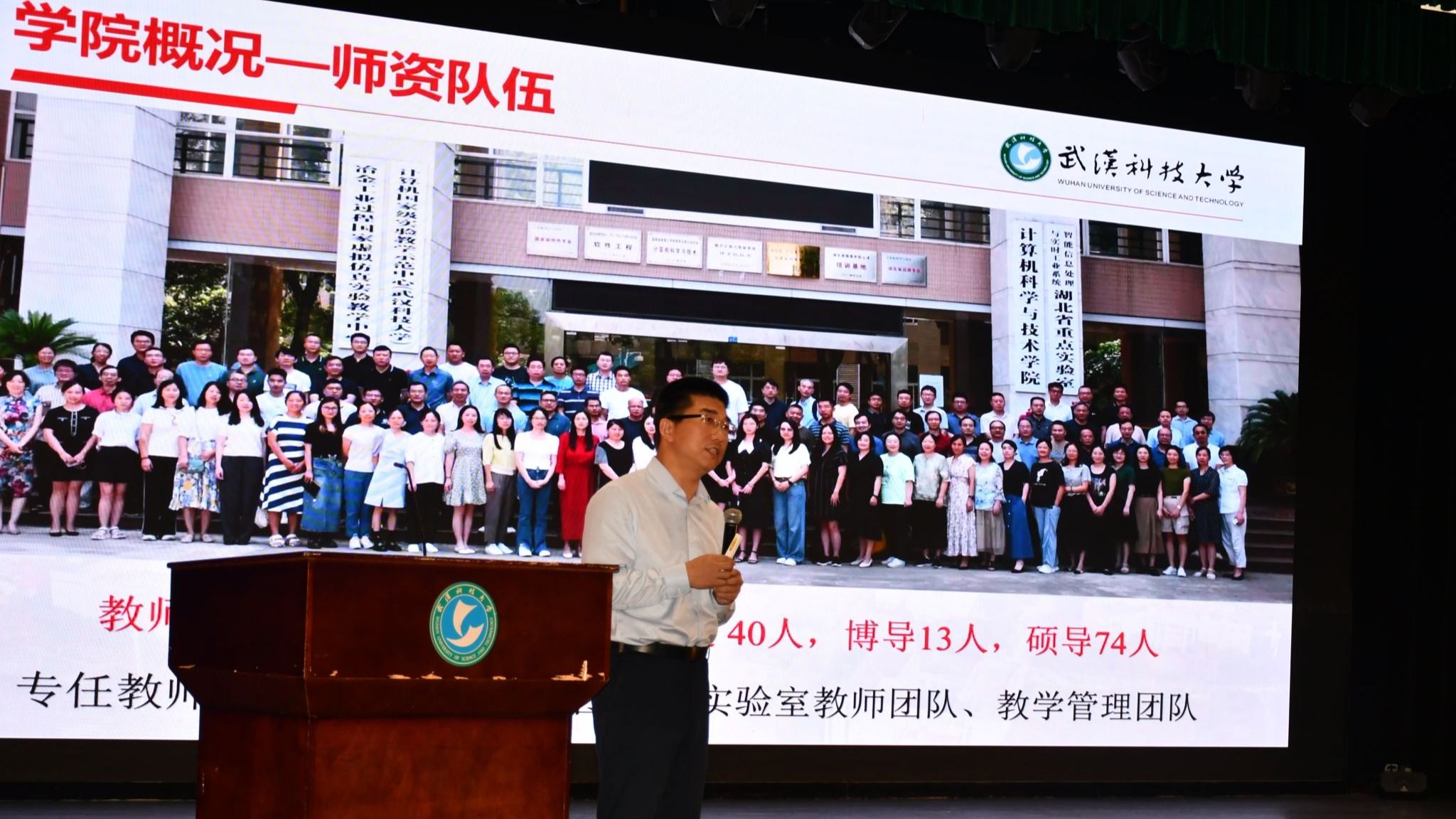 “117名教师,26位教授领衔,40位副教授护航,13位博导掌舵——这是你们的‘学术梦之队’。”张凯的话语引来全场掌声。他特别介绍了“宝钢优秀教师奖”得主张晓龙教授的“代码诗人”教学风格:“张老师的《软件工程》课,能让抽象概念变得鲜活有趣。”屏幕上同步播放着张晓龙老师上课的画面,以及网络工程系获评“湖北省优秀基层教学组织”的荣誉证书。“国家级教学成果奖2项、省级6项,《C语言程序设计》等国家级一流课程……这些不是冰冷的数字,而是照亮你们求知路的灯塔。”
